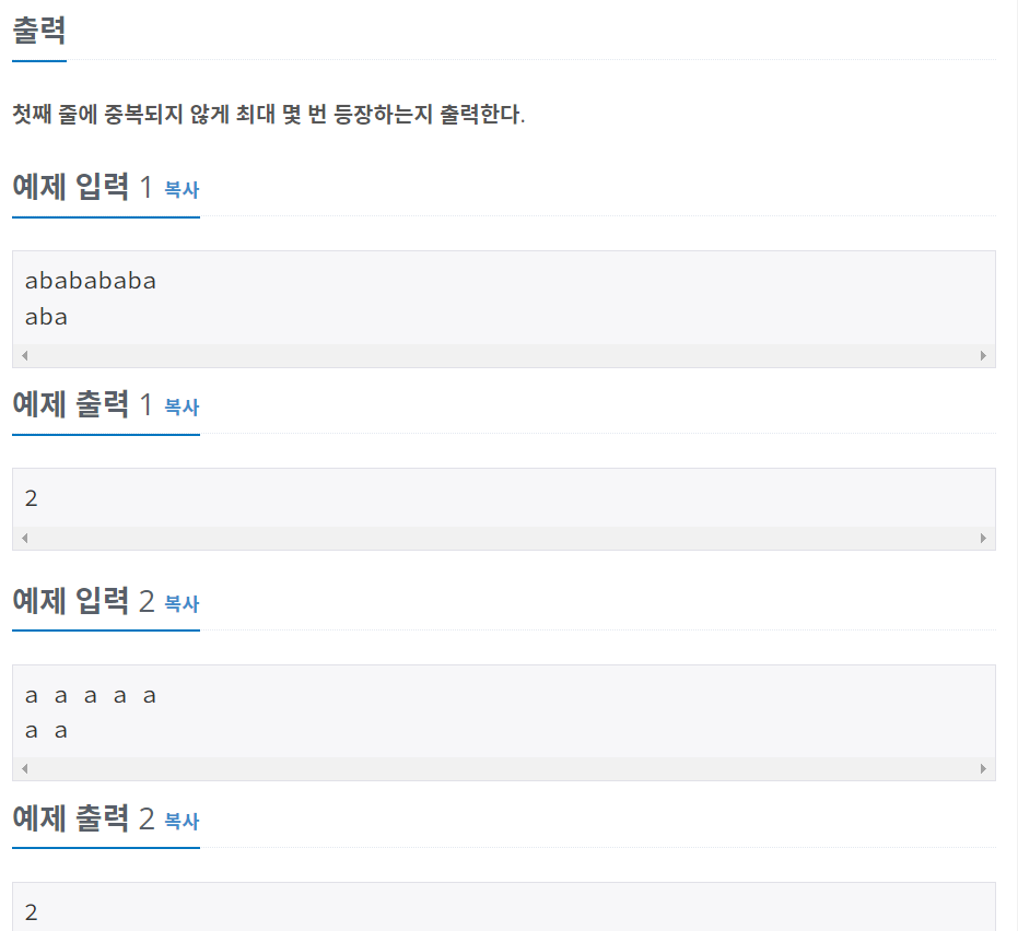 - 첫째 줄이 문서, 둘째 줄이 검색하고 싶은 단어이다.