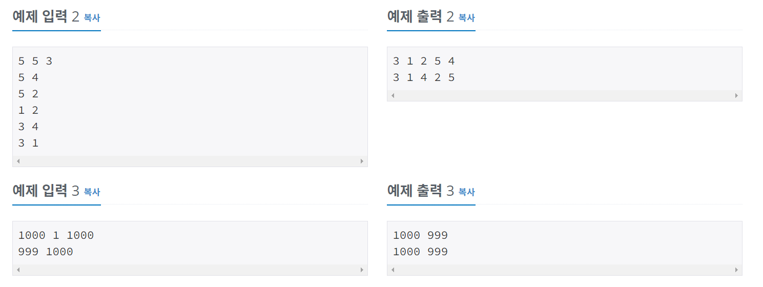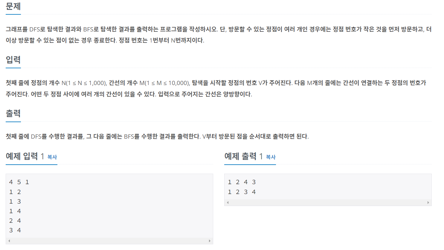 첫째 줄에 정점의 개수 N(1 ≤ N ≤ 1,000), 간선의 개수 M(1 ≤ M ≤ 10,000), 탐색을 시작할 정점의 번호 V가 주어진다. 다음 M개의 줄에는 간선이 연결하는 두 정점의 번호가 주어진다. 어떤 두 정점 사